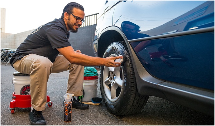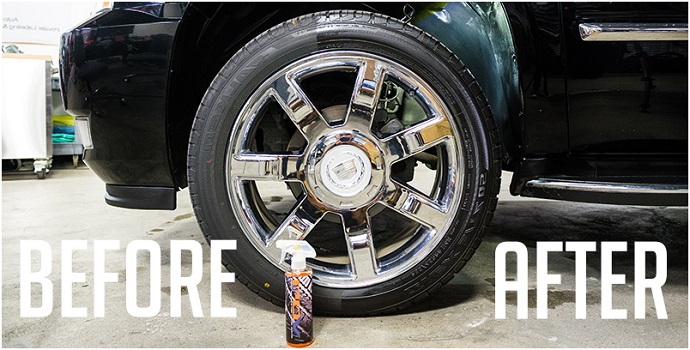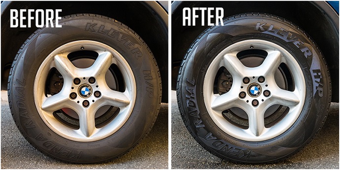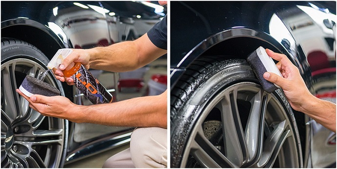 Pulvériser directement sur un tampon applicateur en mousse ou une brosse à détails pour éviter les excès de pulvérisation sur la peinture ou la mise en commun dans les bandes de roulement des pneus qui conduisent à l'élingue de pneu.