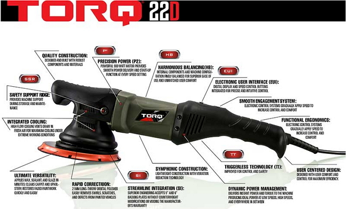 Le TORQ22D a été conçu avec deux idées simples: un maximum de confort et des performances supérieures. Le 22D dispose de tous les composants internes et de la machine mise en page pour la haute performance détaillant pour tous les utilisateurs. Le moteur, les engrenages, et le système d'entraînement interne sont équilibrées contre les deux poignées et à la tête de polissage pour améliorer la sensation et le confort. Le cœur du 22D est un moteur de 900 watts puissant assez robuste pour gérer tout travail. Precision Power (de P²) commandes électriques fournissent une puissance douce et la poussée de la puissance maximale du moteur à chaque réglage de la vitesse. La machine innovante est construite en utilisant des matériaux de construction robuste pour durer des années de détailler l'utilisation par un professionnel ou amateur. Le TORQ22D est l'état de l'art pour les machines polisseurs, et est le choix idéal pour tous les detailers. La construction durable, solide et léger du 22D va durer des années. Le TORQ 22D polisseuse orbitale: Tomorrow’s Detailing Tool, Today!